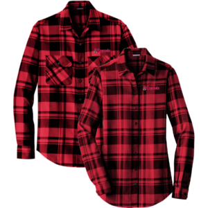 4.4 oz. 60/40 cotton/poly flannel, back yoke, brushed for softness (mens style has 2 chest pockets — ladies style has no pockets) — embroidered left chest with small buffalo