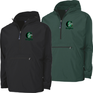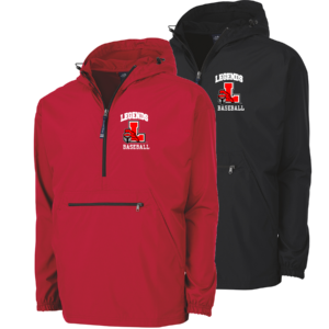 100% Softex™ polyester, wind & water-resistant, packs into its own front pouch pocket with zipper closure and self-fabric loop for easy packing on the go — embroidered logo left chest and full back